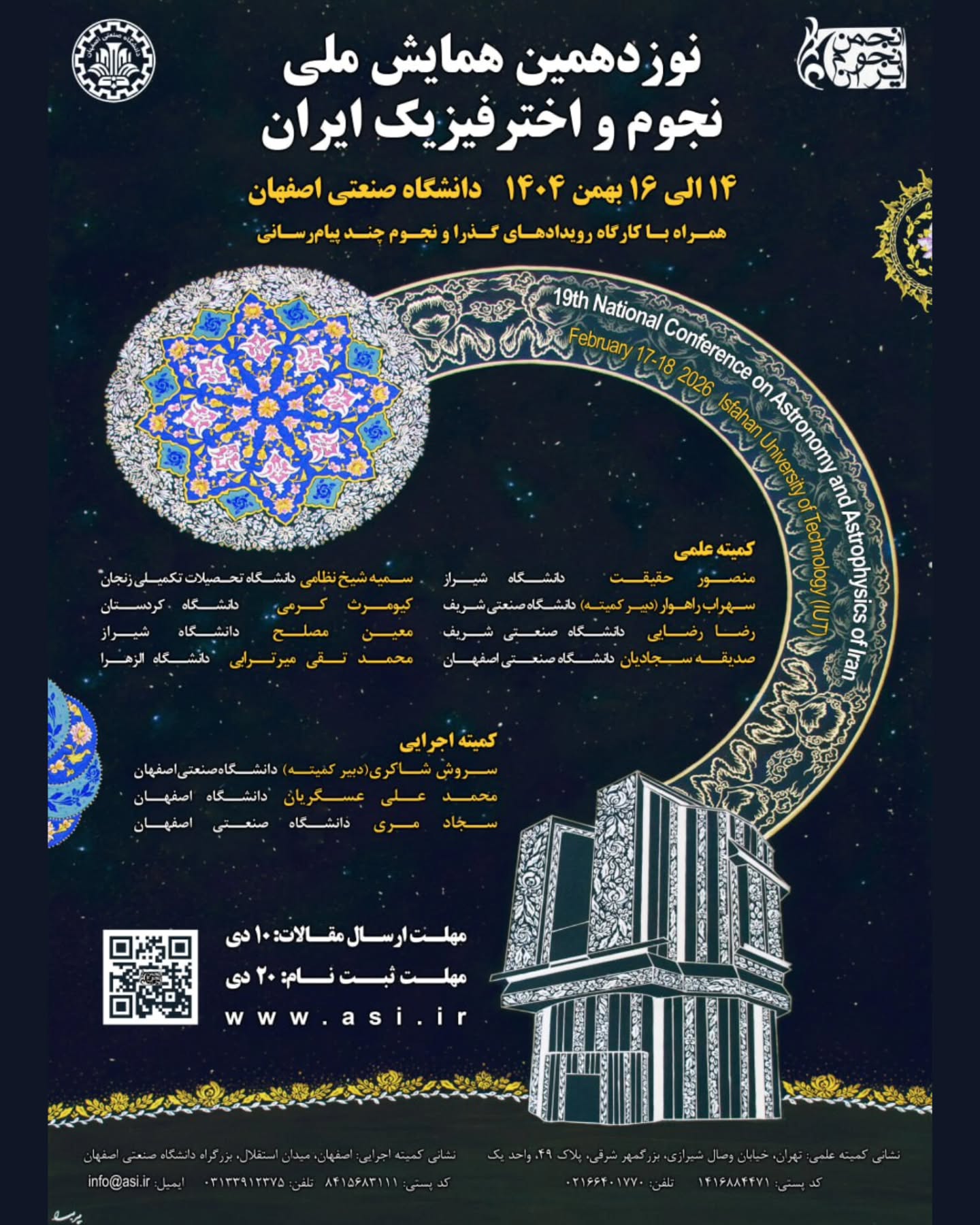 نوزدهمین همایش ملی نجوم و اخترفیزیک ایران از 14 تا 16 بهمن 1404 با همکاری انجمن نجوم ایران در دانشگاه صنعتی اصفهان برگزار میشود