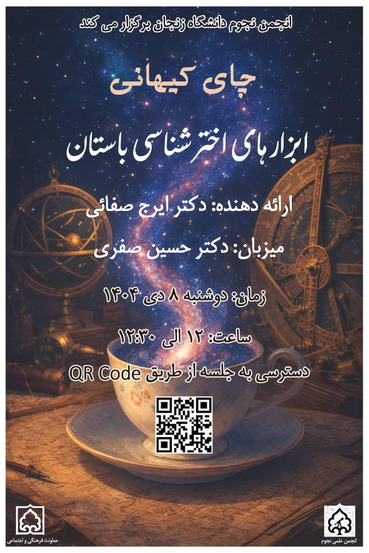 به کوشش انجمن اخترشناسی دانشگاه زنجان، وبینار ابزارهای اخترشناسی باستان با ارائه دکتر ایرج صفایی در روز دوشنبه 8 آذر 1404 از ساعت 12:00 برگزار میشود.